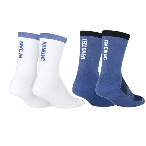 The SAYSKY Combat High Socks are designed to look cool and make your run super effective on all distances. Put these on and your feet have never felt so in sync with your shoes. These are high calf socks in blue and white with a statement on the back.